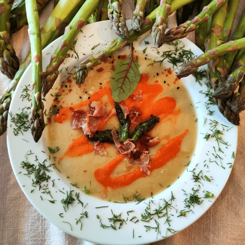 podany z chipsem z szynki szwardzwaldzkiej, kremem pomidorowym, zielonym szparagiem